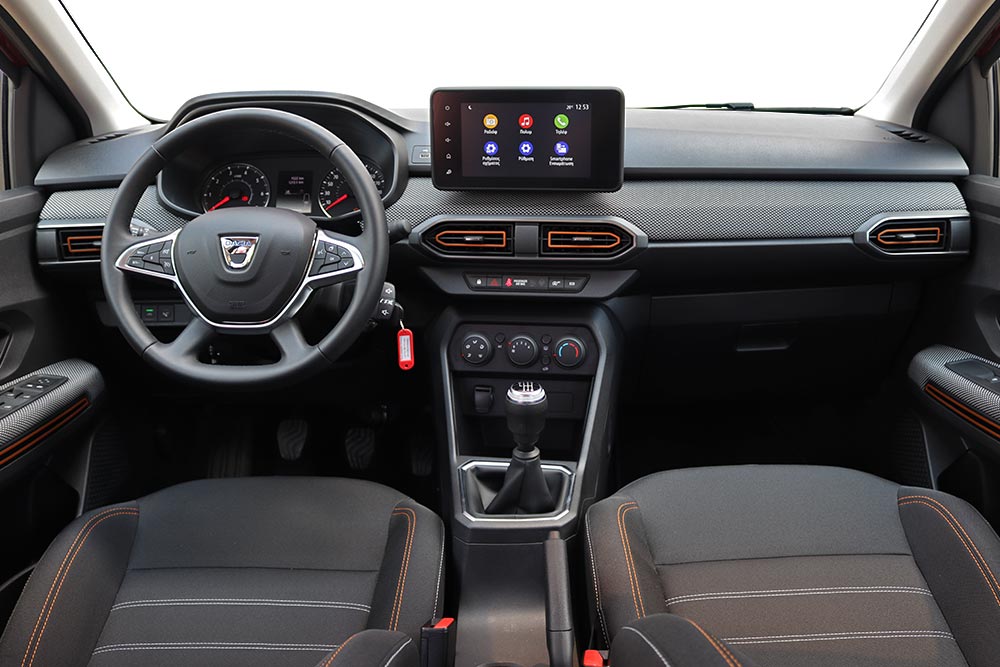 Το εσωτερικό του μικρού Crossover της Dacia κερδίζει τις πρώτες εντυπώσεις με τον όμορφο σχεδιασμό του. Τα σκληρά πλαστικά είναι στιβαρής συναρμογής, ενώ ευχάριστη νότα αποτελεί η υφασμάτινη επένδυση στο ταμπλό και στις εμπρός πόρτες. Επίσης, η νέα οθόνη αφής των 8 ιντσών με το απλό και εύχρηστο μενού αναβαθμίζει τη συνολική εικόνα. Από πλευράς χώρων, το μήκους 4,1 μ. Sandero Stepway εντυπωσιάζει. Στην καμπίνα του θα φιλοξενηθούν πολύ εύκολα 4 ή και 5 επιβάτες, χάρη και στο αρκετό ωφέλιμο πλάτος του πίσω καθίσματος. Μεγάλο είναι και το βαθύ πορτ μπαγκάζ των 410 λίτρων.