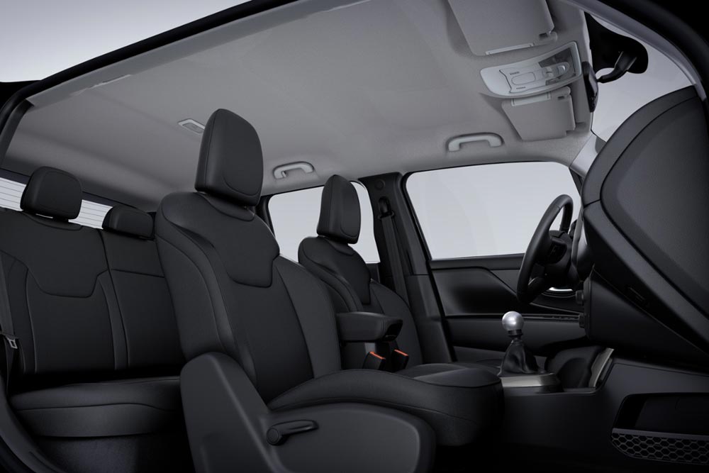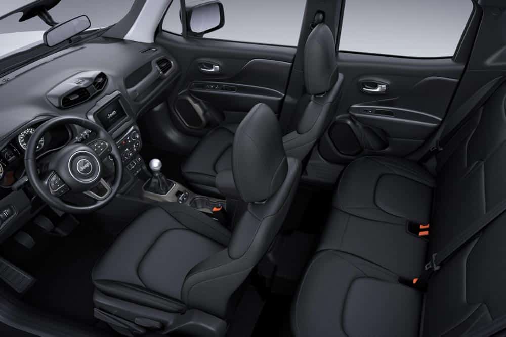 Τα γεωμετρικά σχήματα κυριαρχούν και στο θάλαμο των επιβατών του μικρότερου Jeep, όπως και η χειρολαβή στο ταμπλό από την πλευρά του συνοδηγού. Το εσωτερικό του Renegade είναι προσεγμένο σε κατασκευή, με χρήση μαλακού πλαστικού στο μεγαλύτερο μέρος του ταμπλό και γεροδεμένη συναρμογή των επιμέρους επιφανειών. Ο οδηγός του κάθεται ψηλά και θα βρει εύκολα την κατάλληλη θέση, ενώ θα διευκολυνθεί και από την απρόσκοπτη περιμετρική ορατότητα. Εξίσου άνετα θα μετακινηθούν κι οι υπόλοιποι επιβάτες, οι οποίοι έχουν στη διάθεσή τους ένα πλήρως εκμεταλλεύσιμο πορτ μπαγκάζ 351 λίτρων.