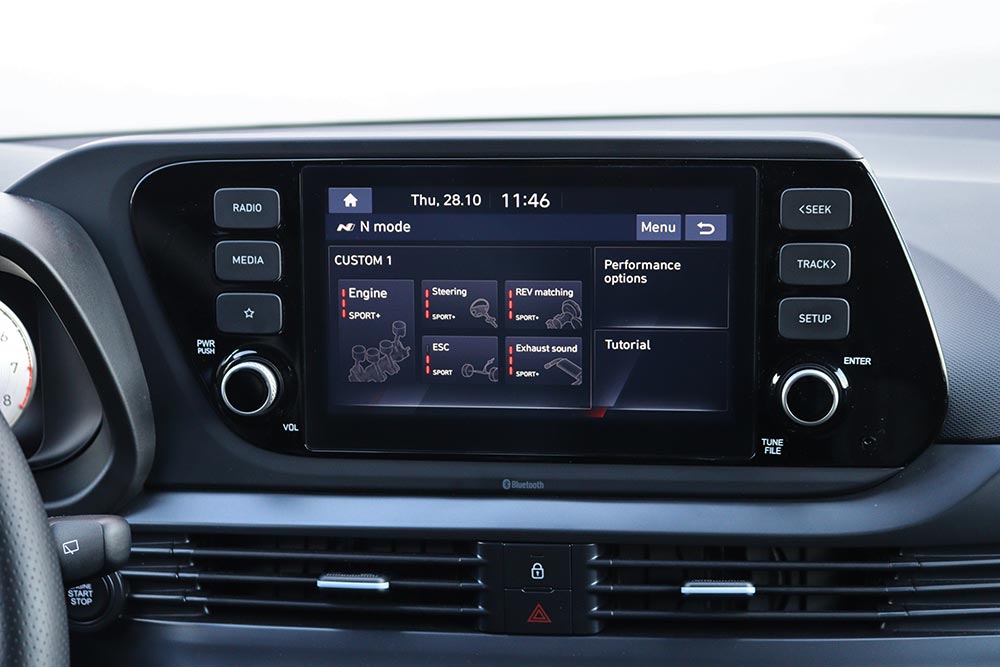 Ετοιμοπόλεμο είναι και το εσωτερικό του, όπου ο οδηγός «αγκαλιάζεται» από το πάρα πολύ καλό σε στήριξη και άνετο τύπου μπάκετ κάθισμα με το ενιαίο προσκέφαλο. Στη διάθεσή του έχει ακόμα το δερμάτινο τιμόνι με την παχιά στεφάνη, τον ενσωματωμένο διακόπτη N αριστερά για την επιλογή των προφίλ οδήγησης και το δεξί πλήκτρο N για την ενεργοποίηση του σπορ προγράμματος N και των εξατομικευμένων σεταρισμένων N Custom. Όσο για το κόκκινο μπουτόν θέτει σε λειτουργία ή όχι το Rev Matching, για να συγχρονίζει τις στροφές του κινητήρα κατά το κατέβασμα των ταχυτήτων.