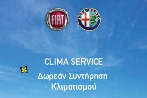 H Fiat Group Automobiles Hellas, αντιλαμβανόμενη τη δυσκολία που δημιουργεί η οικονομική κρίση σε πολλούς από τους πελάτες της να ανταποκριθούν οικονομικά στις ανάγκες συντήρησης των αυτοκινήτων της, αλλά και γνωρίζοντας πόσο σημαντική είναι αυτή η συντήρηση για τη σωστή λειτουργία του αυτοκινήτου και την ασφάλεια και άνεση των επιβατών, χαρίζει στους κατόχους αυτοκινήτων Fiat, Alfa Romeo και Fiat Professional ένα δώρο αξίας 59 ευρώ με την υπηρεσία "Clima Service". Πρόκειται για μία παροχή που περιλαμβάνει αντικατάσταση του φίλτρου καμπίνας, απολύμανση αεραγωγών και τη σχετική εργασία, ώστε να μην υπάρχουν το καλοκαίρι τα προβλήματα που εμφανίζονται κατά τη λειτουργία των κλιματιστικών μετά τη χειμερινή αδράνεια.