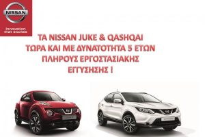 Η Nissan, προσφέρει στους υποψήφιους αγοραστές αλλά και ήδη κατόχους Juke και Qashqai, δυνατότητα επέκτασης της εργοστασιακής εγγύησης των οχημάτων τους, στα 5 έτη. Με τον τρόπο αυτό, οι επιπλέον επιλογές για τα μοντέλα Juke και Qashqai έχουν ως εξής :