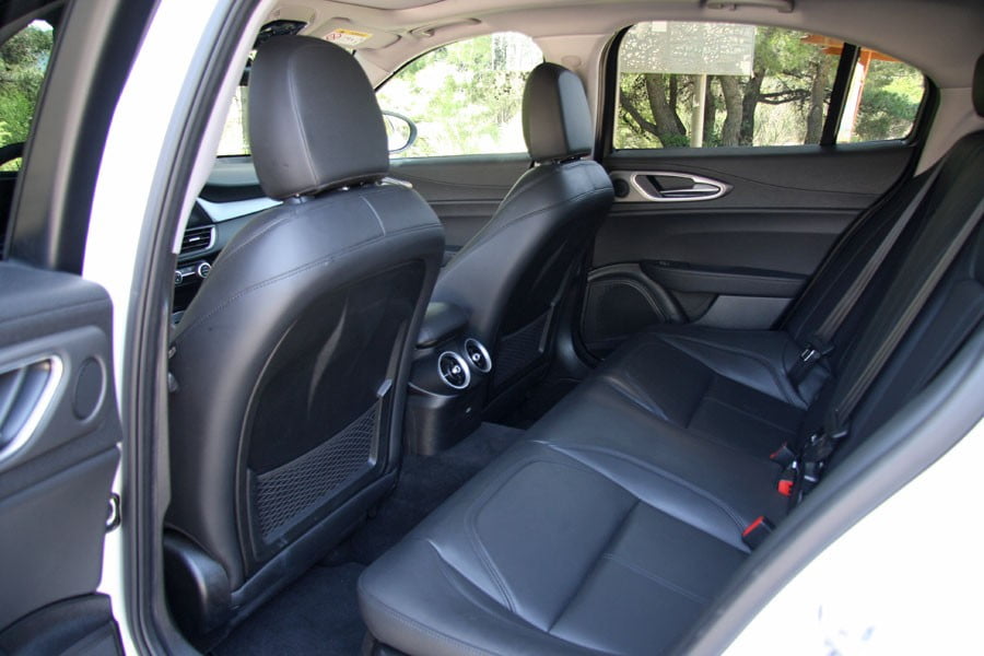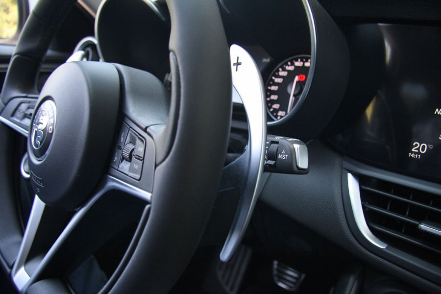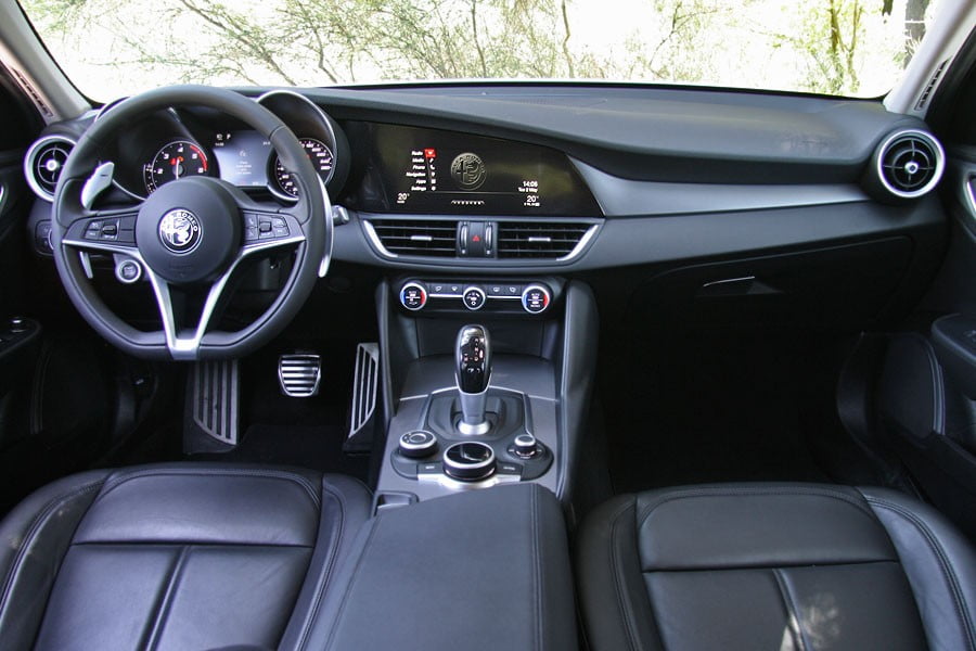Η καμπίνα της Alfa Romeo Giulia δεν θα μπορούσε να μην ανταποκρίνεται στην ομορφιά του αμαξώματος. Ανοίγοντας την πόρτα βρίσκεσαι αντιμέτωπος με ένα τιμόνι που παραπέμπει σε… Ferrari, χάρη στο μπουτόν εκκίνησης που είναι ενσωματωμένο επάνω του, φτιάχνοντάς σου την διάθεση. Μία διάθεση που απογειώνεται με το που κάτσεις στην εξαιρετική θέση οδήγησης με το μεγάλο εύρος ρυθμίσεων. Οι γραμμές του ταμπλό είναι… καθαρές και λιτές, τα υλικά είναι σε κορυφαίο επίπεδο (πλην κάποιων ελαχίστων εξαιρέσεων) και η συναρμογή σε πείθει. Ο πίνακας οργάνων είναι ευανάγνωστος, ο περιστροφικός διακόπτης που θυμίζει BMW iDrive (είναι για τον έλεγχο του συστήματος πολυμέσων) προσθέτει πόντους στην πολύ καλή εργονομία και το χειριστήριο για το D.N.A. (με τα τρία προγράμματα οδήγησης) είναι εύκολα προσβάσιμο. Μοναδική εργονομική παραφωνία τα μεγάλα paddles πίσω από το τιμόνι τα οποία είναι σταθερά και μπορεί να διευκολύνουν τις αλλαγές σε γρήγορη οδήγηση και με το τιμόνι σε μεγάλη κλίση, εμποδίζουν όμως τη χρήση των χειριστηρίων για φλας και υαλοκαθαριστήρες (χρειάζεται μία μικρή εξοικείωση, μέχρι να συνηθίσεις τις αποστάσεις και να μην πέφτουν τα δάχτυλά σου σε λάθος σημείο). Όσον αφορά στους χώρους της Giulia, τέσσερις ενήλικες δεν θα έχουν θέμα, με το πίσω κάθισμα να είναι ακόμη και για τρεις ικανοποιητικό αλλά το μεγάλο τούνελ μετάδοσης κίνησης να κουράζει τον μεσαίο πίσω επιβάτη σε μεγάλες μετακινήσεις. Ο χώρος αποσκευών είναι στα 480 λίτρα, τιμή που δεν αφήνει χώρο… σε παράπονα, ενώ στο εσωτερικό υπάρχουν αρκετές θήκες για μικροαντικείμενα. Φάουλ η ύπαρξη της μίας ποτηροθήκης, με την δεύτερη ακριβώς δίπλα της να έχει χάσει την ικανότητά της να φιλοξενήσει ποτήρι, καθώς μέσα της οι Ιταλοί θεώρησαν σωστό να τοποθετήσουν τον αναπτήρα του αυτοκινήτου…