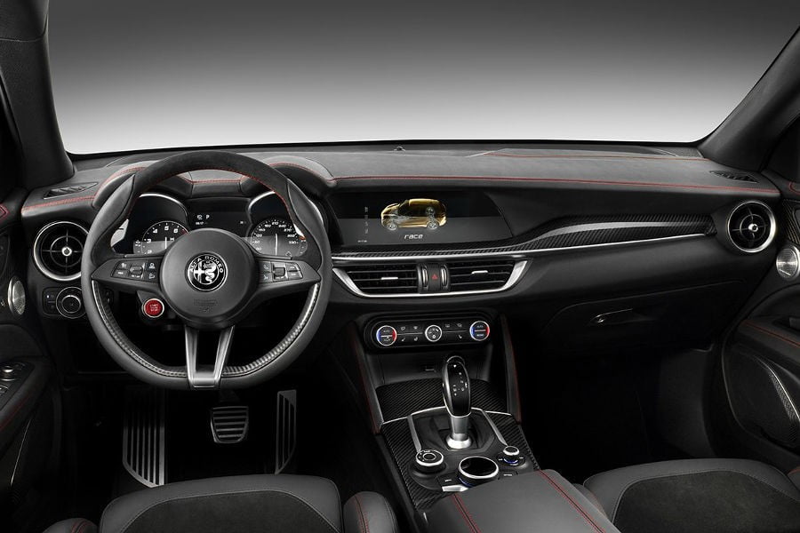 Ο εξοπλισμός της Alfa Romeo Stelvio Quadrifoglio περιλαμβάνει μεταξύ άλλων εισαγωγές αέρα στο καπό, αναδιπλούμενους εξωτερικούς καθρέφτες, ζάντες αλουμινίου 20 ιντσών, μαύρες δαγκάνες φρένων, σαλόνι σε συνδυασμό δέρματος αλκαντάρας, καθίσματα οδηγού και συνοδηγού 6 ρυθμίσεων με αφρώδες υλικό στο κέντρο, σπορ δερμάτινο τιμόνι, ταμπλό από ανθρακονήματα, έγχρωμη οθόνη 7 ιντσών, κάμερα οπισθοπορείας καθώς και περιμετρικούς αισθητήρες παρκαρίσματος.