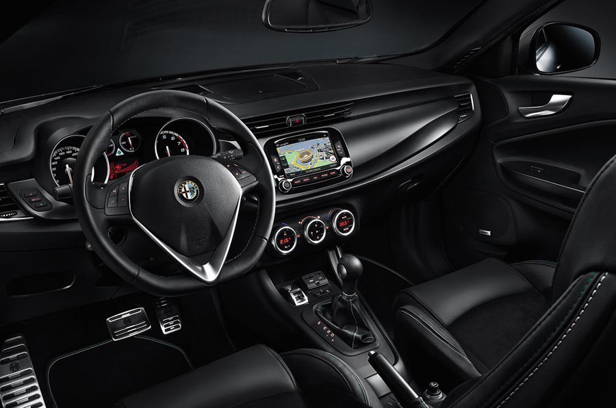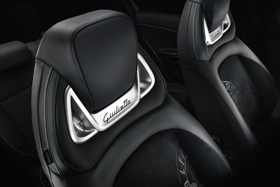Στο εσωτερικό τον σπορ χαρακτήρα της ανανεωμένης Giulietta Quadrifoglio Verde τονίζουν τα καθίσματα με δέρμα – αλκαντάρα και το ενιαίο προσκέφαλο, το νέο τιμόνι με λευκές ή κόκκινες ραφές, ο δερμάτινος επιλογέας και χειρόφρενο, τα αλουμινένια πεντάλ, η μαύρη οροφή, ο πίνακας οργάνων με το λογότυπο QV κ.α.
