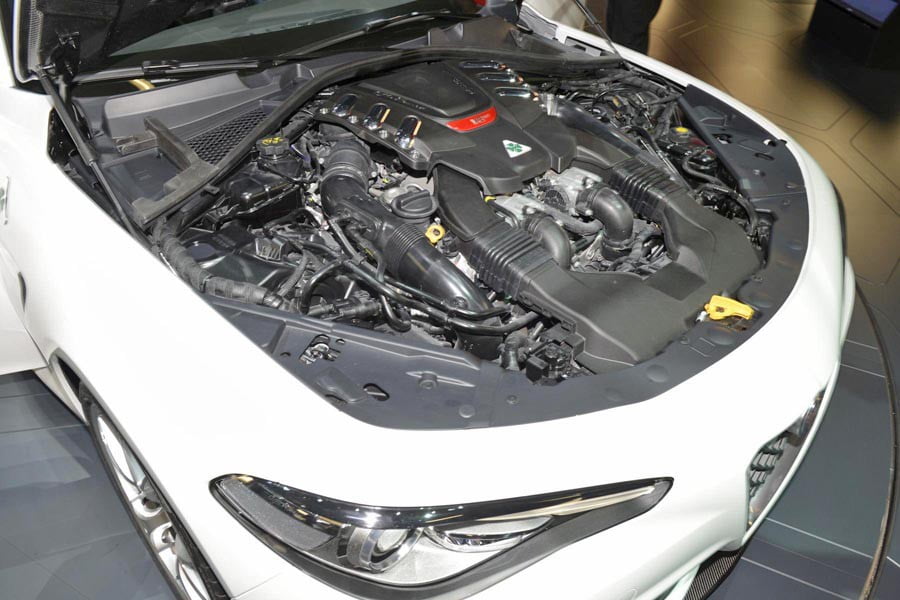 Η Alfa Romeo Giulia κάνει παγκόσμιο ντεμπούτο στην Έκθεση Αυτοκινήτου της Φρανκφούρτης και το κοινό έχει την ευκαιρία να δει από κοντά το κορυφαίο ιταλικό μεσαίο αυτοκίνητο από έξω, μέσα και να περιεργαστεί από κοντά το πανίσχυρο μοτέρ της. Ο τεχνολογίας Ferrari 6κύλινδρος biturbo κινητήρας απόδοσης 510 ίππων και 600 Nm ροπής είναι τοποθετημένος πίσω από τον εμπρός άξονα έτσι ώστε να επιτευχθεί το ιδανικό ζύγισμα 50:50 ανά άξονα.