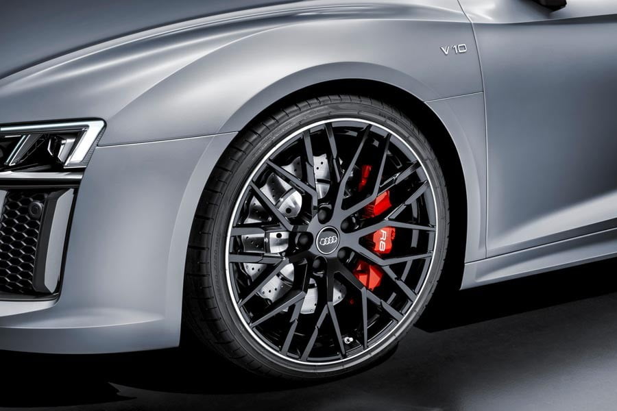 Την έντονα σπορτίφ εικόνα του supercar της Audi ενισχύουν με την σειρά τους το σπόιλερ στον εμπρός προφυλακτήρα, ο μεγάλος κεντρικός αεραγωγός, ο διαχύτης πίσω, οι τραπεζοειδείς απολήξεις των εξατμίσεων και οι 20 ιντσών σφυρήλατες ζάντες αλουμινίου με ελαστικά 245/30 εμπρός και 305/30 πίσω. Μία ακόμα ξεχωριστή λεπτομέρεια αποτελούν οι κόκκινες δαγκάνες των φρένων στην έκδοση R8 V10, ή οι ανθρακί με τα κεραμικά δισκόφρενα στο R8 V10 plus.