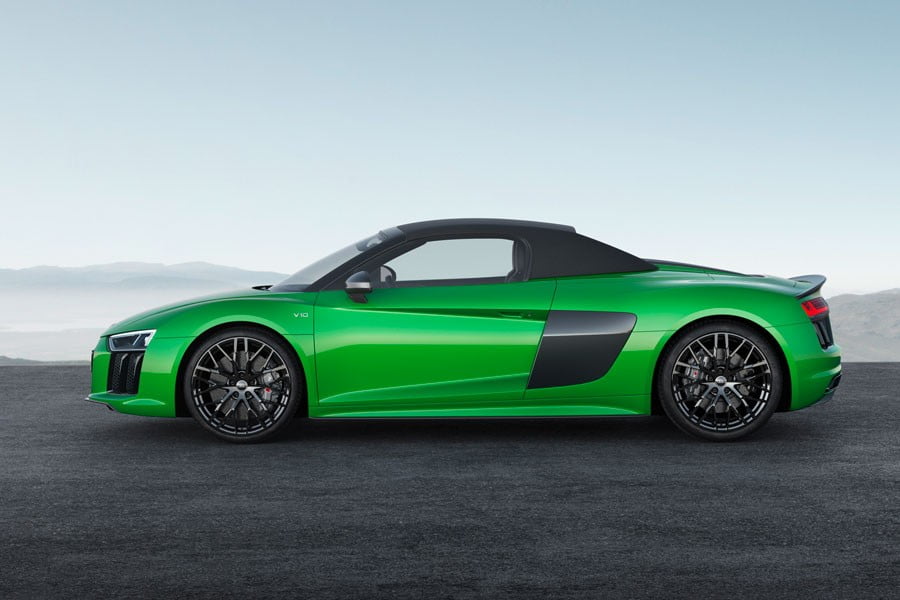 Ο ατμοσφαιρικός V10 κινητήρας των 5.2 λτ. αποδίδει 610 ίππους και 560 Nm ροπής στις 6.500 σ.α.λ., ενώ το στροφόμετρο μπαίνει βαθιά στα κόκκινα, φτάνοντας έως τις 8.700 σ.α.λ. Σε συνδυασμό με το 7τάχυτο S tronic κιβώτιο, το βάρους 1.587 κιλών R8 Spyder V10 plus επιταχύνει από 0-100 χλμ./ώρα σε 3,3 δευτερόλεπτα, η τελική του ταχύτητα φτάνει τα 328 χλμ./ώρα, η κατανάλωση είναι 12,5 λτ./100 χλμ. και οι εκπομπές CO2 στα 292 γρ./χλμ. Να υπενθυμίσουμε ότι το R8 Spyder V10 έχει ισχύ 540 ίππων και ροπή 540 Nm, επιταχύνει από 0-100 χλμ./ώρα σε 3,6 δευτερόλεπτα και η τελική του ταχύτητα αγγίζει τα 318 χλμ./ώρα.