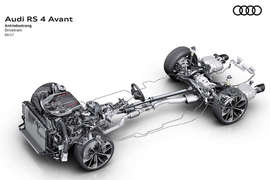 Εφοδιασμένο με τον 2.9 λτ. V6 biturbo κινητήρα των 450 ίππων και 600 Nm ροπής, επιταχύνει από 0-100 χλμ./ώρα σε 4,1 δευτερόλεπτα και η τελική του ταχύτητα φτάνει τα 250 χλμ./ώρα ή 280 χλμ./ώρα με το προαιρετικό πακέτο RS dynamic. Η δύναμη περνάει σε όλους τους τροχούς μέσω του αυτόματου 8τάχυτου κιβωτίου tiptronic και της μόνιμης τετρακίνησης quattro. Επιπλέον, η Audi προσφέρει εξτρά ένα πίσω σπορ διαφορικό. Το νέο Audi RS 4 Avant ζυγίζει 1.790 κιλά (80 κιλά λιγότερα από το προγενέστερο), καταναλώνει 8,8 λτ./100 χλμ. και εκπέμπει 199 γρ./χλμ. CO2 (17% μείωση σε σχέση με το προηγούμενο μοντέλο). Επίσης, διαθέτει χαμηλωμένη κατά 5 χιλιοστά σπορ ανάρτηση και προαιρετικά διατίθεται με Dynamic Ride Control, κεραμικά δισκόφρενα και ειδικά τροποποιημένο RS dynamic τιμόνι.