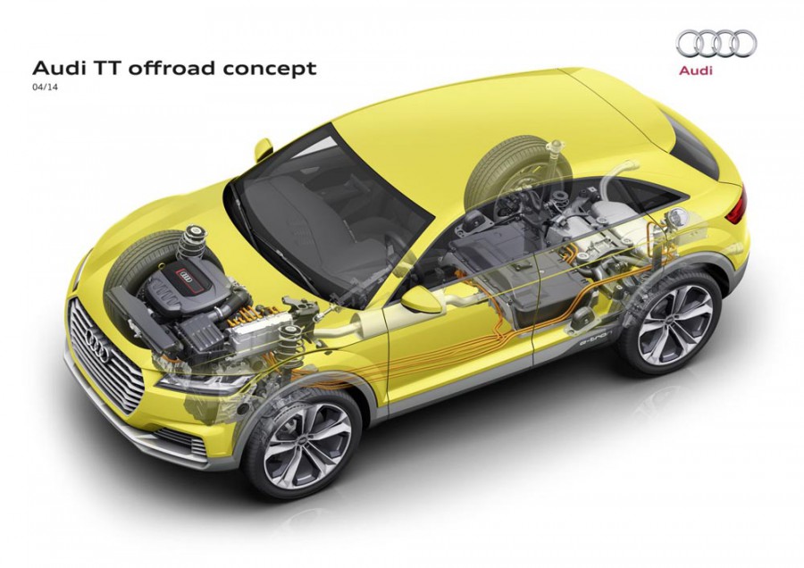 Το Audi TT offroad concept βασίζεται στην πλατφόρμα MQB και στο διαστάσεων 4,39 μ. μήκους, 1,85 μ. πλάτους, 1,53 μ. ύψους και με 2,63 μ. μεταξόνιο αμάξωμά του πολλά τμήματα είναι κατασκευασμένα από αλουμίνιο. Από το ελαφρύ αυτό μέταλλο αποτελούνται τμήματα της εμπρός ανάρτησης με τα γόνατα ΜακΦέρσον, ενώ πίσω υπάρχουν τετραπλοί σύνδεσμοι.