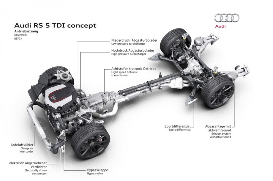 Πριν από δύο περίπου χρόνια, τον Σεπτέμβριο του 2012, η Audi είχε παρουσιάσει για πρώτη φορά το ηλεκτρικό turbo για τους ντίζελ TDI κινητήρες και τώρα κάνει ένα ακόμα βήμα εμπρός με το πρωτότυπο RS 5 TDI με την τεχνολογία Audi electric turbo. Το εν λόγω concept βασίζεται στο RS 5, ωστόσο αντί του V8 4.2 FSI κινητήρα των 450 ίππων και 430 Nm ροπής, χρησιμοποιεί τον τελευταίας γενιάς 3.0 V6 TDI με τους 272 ίππους και 600 Nm ροπής με διπλά turbo, από τα οποία το ένα συνδυάζεται με ηλεκτροκινητήρα. Έτσι μειώνεται ακόμα περισσότερο το turbo lag και βελτιώνεται η απόκριση, χαρίζοντας στον κινητήρα περισσότερη γραμμικότητα. Το ηλεκτρικό turbo λειτουργεί από τις πολύ χαμηλές στροφές και το μεγαλύτερο turbo από τις 3.000 σ.α.λ. και άνω.