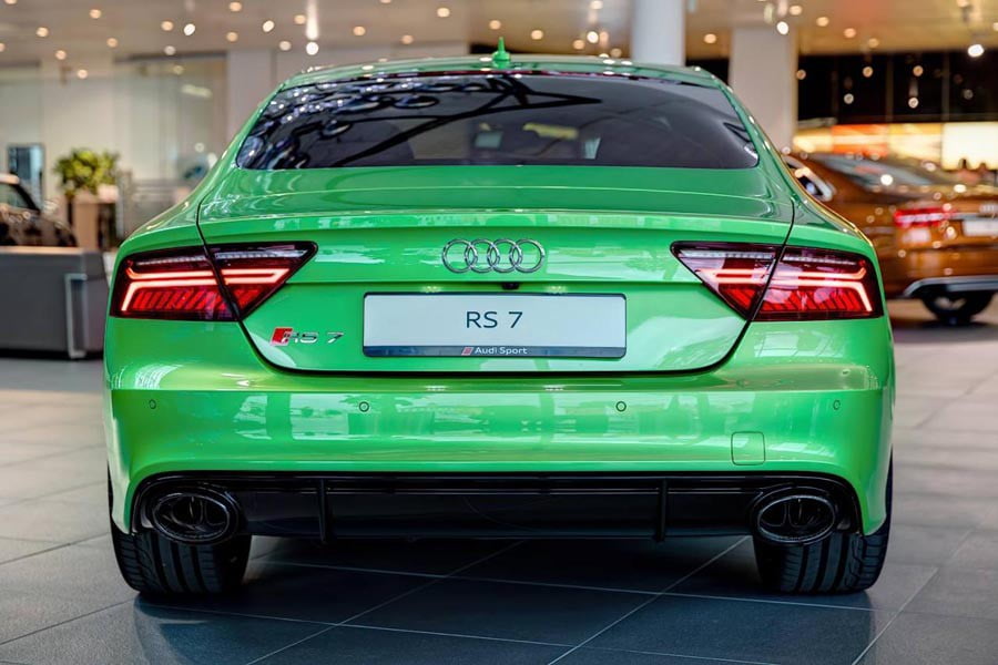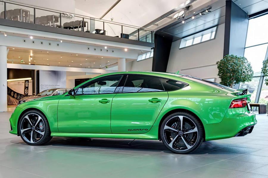 Το τμήμα εξατομίκευσης Audi Exclusive δημιούργησε το μοναδικό εικονιζόμενο Audi RS 7 Sportback σε πράσινο μεταλλικό χρώμα «Apple Green», το οποίο παράλληλα εφοδιάζεται και με άλλα αποκλειστικά στοιχεία. Το ειδικό αυτό «πρασινάκι» κόστισε επιπλέον 2.750 ευρώ και συνδυάζεται με μαύρους καθρέπτες (105€), προαιρετικό σύστημα εξάτμισης RS (1.000€) και δίχρωμες, πέντε ακτινών ζάντες αλουμινίου 21 ιντσών (2.000€), με ελαστικά διαστάσεων 275/30.