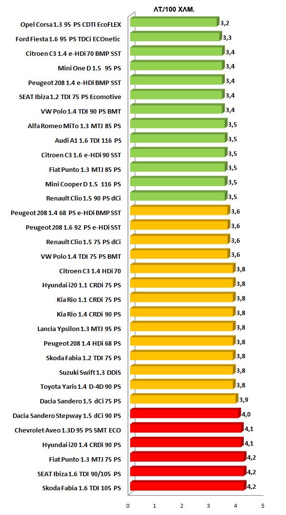 Στην συγκεκριμένη παρουσίαση συγκεντρώσαμε όλα τα μικρά αυτοκίνητα που πωλούνται στην χώρα μας με κινητήρες πετρελαίου και παραθέτουμε τις καταναλώσεις τους σε μεικτές συνθήκες. Να σημειώσουμε ότι όλες οι καταναλώσεις που αναγράφονται είναι οι εργοστασιακές και μάλλον «άπιαστες», αφού σε πραγματικές συνθήκες η κατανάλωση είναι μεγαλύτερη κατά μέσο όρο στα περίπου συν 2 λτ./100 χλμ.