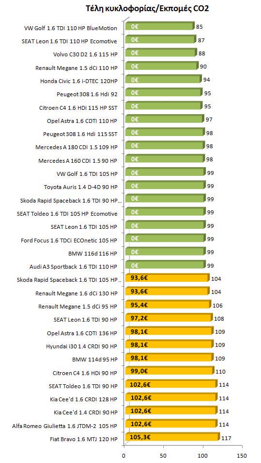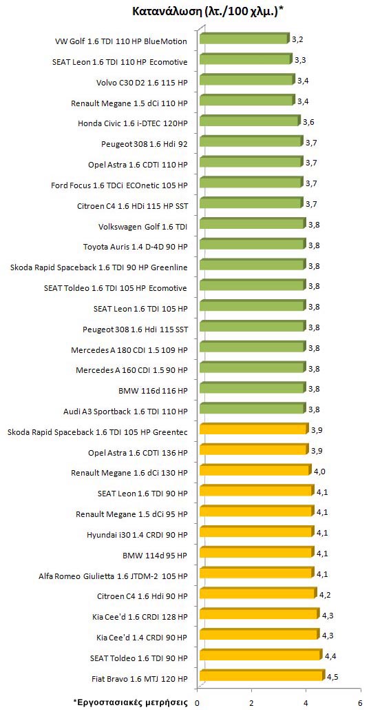 Τα μικρά μαζί με τα μικρομεσαία αυτοκίνητα συγκεντρώνουν το μεγαλύτερο μερίδιο των πωλήσεων όχι μόνο στην χώρα μας αλλά και στην Ευρώπη, ενώ οι εκδόσεις με τους ντίζελ κινητήρες έχουν μεγάλη ζήτηση, λόγω κυρίως της σημαντικής οικονομίας σε καύσιμο. Όπως στα μικρά ντίζελ, έτσι και στα μικρομεσαία υπάρχουν πάρα πολλές προτάσεις με κινητήρες πετρελαίου, οι οποίες προσφέρουν πολύ χαμηλές καταναλώσεις που ξεκινούν από τα μόλις 3,2 λτ./100 χλμ. (στο VW Golf 1.6 TDI 110 HP BlueMotion), ενώ πολλά από αυτά εκπέμπουν κάτω από 100 γρ./χλμ. CO2, κάτι που σημαίνει ότι απαλλάσσονται από τα τέλη κυκλοφορίας. Στο συγκεκριμένο αφιέρωμα συγκεντρώσαμε όλα τα μικρομεσαία ντίζελ της αγοράς με κινητήρες έως 1.600 κ.εκ. και σας παρουσιάζουμε τις καταναλώσεις τους και τις εκπομπές CO2, σύμφωνα με τα επίσημα στοιχεία που ανακοινώνουν οι κατασκευαστές.