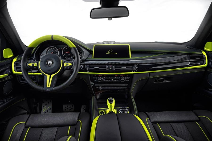 Ιδιαίτερο χαρακτηριστικό στοιχείο της BMW X6 M της Lumma Design αποτελεί και το χτυπητό κίτρινο χρώμα του αμαξώματος, το οποίο συνεχίζεται και στο αναβαθμισμένο εσωτερικό του αυτοκινήτου με τις νέες δερμάτινες επενδύσεις.