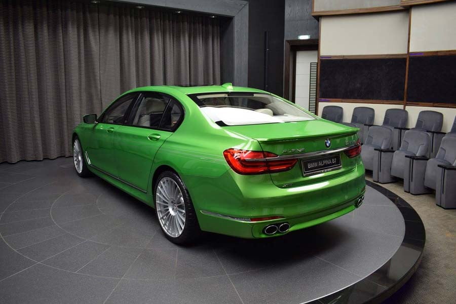 Και όμως ένας πελάτης της BMW από το Άμπου Ντάμπι ξέφυγε από τα τετριμμένα και παρήγγειλε με νέα 7άρα σε πράσινο μεταλλικό χρώμα Java Green και με αναβαθμίσεις από την Alpina. Η ολοκαίνουργια BMW Alpina B7, εκτός από το φανταχτερό της χρώμα που βγάζει μάτια, διακρίνεται από τα περιμετρικά σπόιλερ, τις τετραπλές στρογγυλές απολήξεις των εξατμίσεων, τις πολυάκτινες ζάντες αλουμινίου και τα λογότυπα ALPINA.