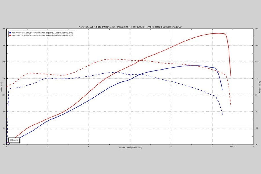 Το νέο πακέτο αναβάθμισης που ονομάζεται «Super 175» («Super 200» ονομάζεται η αναβάθμιση για το νέο MX-5) αλλάζει το χρονισμό των βαλβίδων και επεμβαίνει στους εκκεντροφόρους του ατμοσφαιρικού 1.800άρη κινητήρα. Σε συνδυασμό με τον επαναπρογραμματισμό του εγκεφάλου και τη νέα εξαγωγή προσφέρονται επιπλέον 39 ίπποι και 20 Nm ροπής (175 PS και 194 Nm). Παράλληλα, η BBR φροντίζει ώστε η μέγιστη ροπή να προσφέρεται από πιο χαμηλά (3.000 σ.α.λ.), διευκολύνοντας την καθημερινή χρήση.