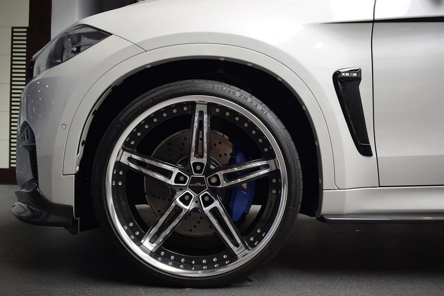 H εικονιζόμενη BMW X6 M πατάει σε σφυρήλατες ζάντες 23 ιντσών της AC Schnitzer, ενώ για καλύτερο ήχο και μερική δύναμη παραπάνω φροντίζει το σύστημα εξάτμισης της Akrapovic με τις carbon απολήξεις.