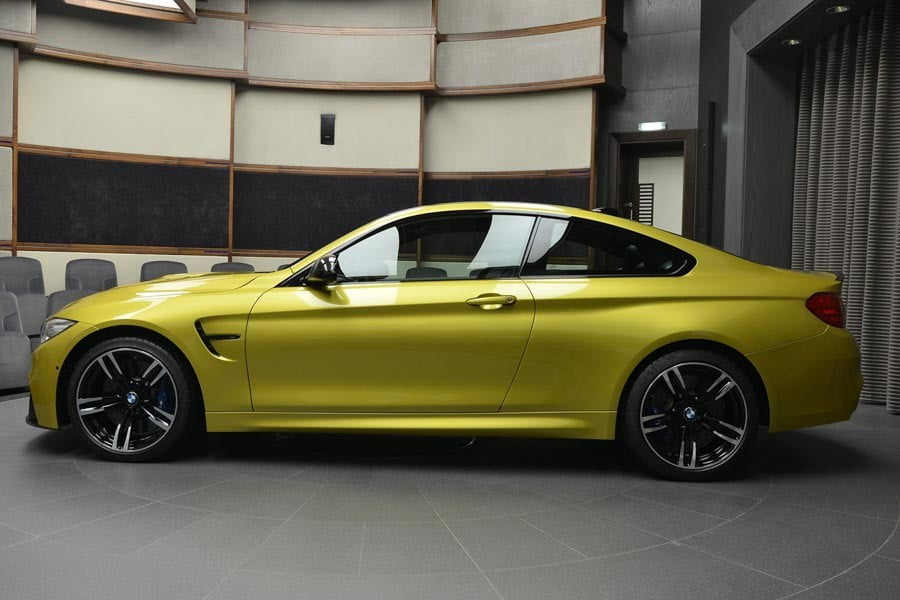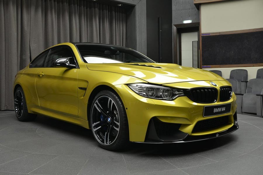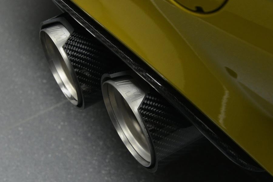 Η εικονιζόμενη BMW M4 Coupe σε κίτρινο χρώμα Austin Yellow -το οποίο της ταιριάζει πολύ- εξοπλίζεται με διάφορα εξτρά της M Performance, όπως είναι εξωτερικά η διακριτική carbon αεροτομή στο πίσω καπό, η μαύρη μάσκα, οι καθρέπτες και το εμπρός σπόιλερ από ανθρακόνημα και η εξάτμιση με τις επίσης carbon απολήξεις. Το πιο εντυπωσιακό όμως στοιχείο σε αυτή τη BMW M4 δεν είναι άλλο από το carbon καπό με τους αεραγωγούς της Manhart.