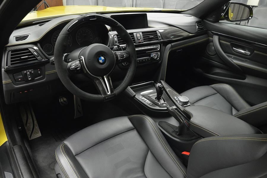 Φουλ στο ανθρακόνημα είναι και το εσωτερικό, το οποίο συναντάται στον επιλογέα των ταχυτήτων, στην κονσόλα, στο χειρόφρενο και στο M Performance τιμόνι με την επένδυση αλκαντάρα και τις ενσωματωμένες ενδείξεις αλλαγής των ταχυτήτων.