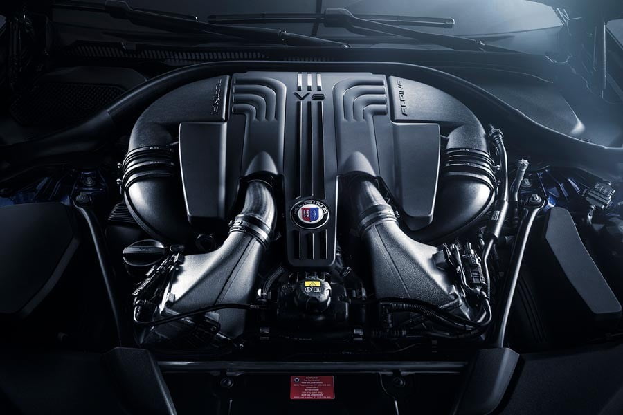 Ξεκινώντας από τον κινητήρα, το V8 Bi-Turbo 4.4 λτ. μηχανικό σύνολο αποδίδει μετά από τις μετατροπές της Alpina 608 ίππους και 800 Nm ροπής μεταξύ 3.000 και 5.000 σ.α.λ. Σε συνδυασμό με το 8τάχυτο αυτόματο κιβώτιο και την τετρακίνηση, το μεγάλο σεντάν των 2.015 κιλών επιταχύνει από 0-100 χλμ./ώρα σε μόλις 3,5 δευτερόλεπτα, η τελική ταχύτητα φτάνει τα 330 χλμ./ώρα, ενώ η κατανάλωση και οι εκπομπές CO2 είναι 10,3 λτ./100 χλμ. και 239 γρ./χλμ.