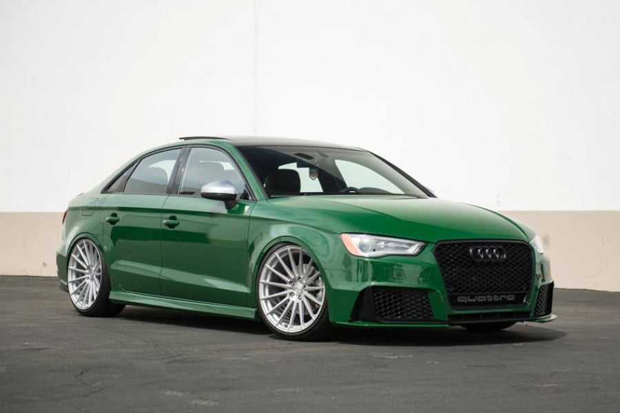 Στο αμερικάνικων προδιαγραφών εικονιζόμενο μοντέλο έχει τοποθετηθεί εμπρός προφυλακτήρας από Audi RS 3 Sportback, ενισχύοντας τη δυναμική του όψη. Επιπλέον το “φτιαγμένο” αυτό A3 Sport Sedan εφοδιάζεται με σπόιλερ από ανθρακόνημα στο πίσω καπό, με ποδιές στα μαρσπιέ και με ένα μεγάλο διαχύτη στον πίσω προφυλακτήρα. Εκεί ξεχωρίζουν με την σειρά τους και οι δύο μεγάλες οβάλ απολήξεις της εξάτμισης. Τη εμφάνιση τύπου… σαύρας ενισχύει με την σειρά της και η πράσινη μεμβράνη που καλύπτει το αμάξωμα.