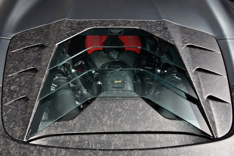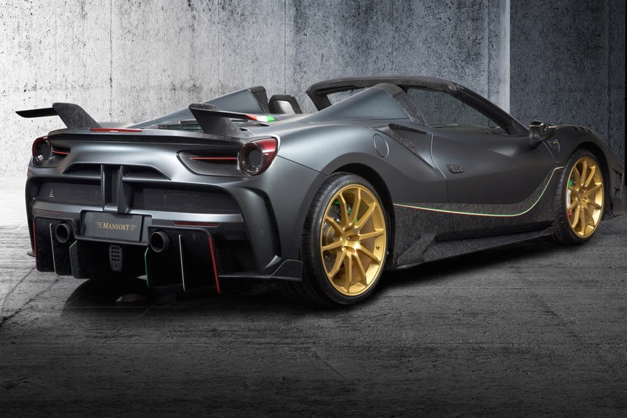 Συνολικά, η εμφάνιση της Ferrari της Mansory είναι άκρως εντυπωσιακή και τονίζεται ακόμη περισσότερο από τον ειδικό ανθρακί χρωματισμό του αμαξώματος, αλλά και τις πολύ ελαφριές χρυσές ζάντες των 20 ιντσών, με ελαστικά 255/30 εμπρός και 325/25 πίσω.