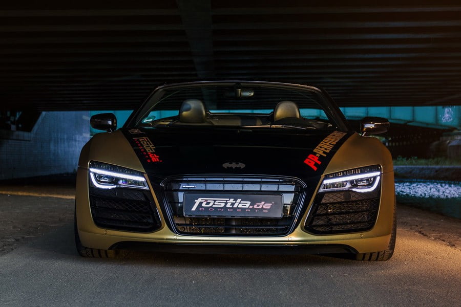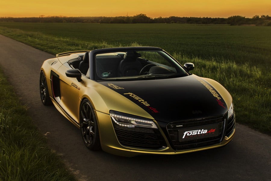 Η γερμανική Fostla αναβαθμίζει σχεδόν σε όλη την υπόστασή του το Audi R8 V10 Spyder, χαρίζοντάς του παράλληλα και με την πρώτη ματιά μια πολύ αγριεμένη εμφάνιση λόγω της ματ χρυσής-χρωμίου μεμβράνης βινυλίου στο αμάξωμα, των φιμέ παραθύρων και φώτων, αλλά και των μαύρων ζαντών στους τροχούς.