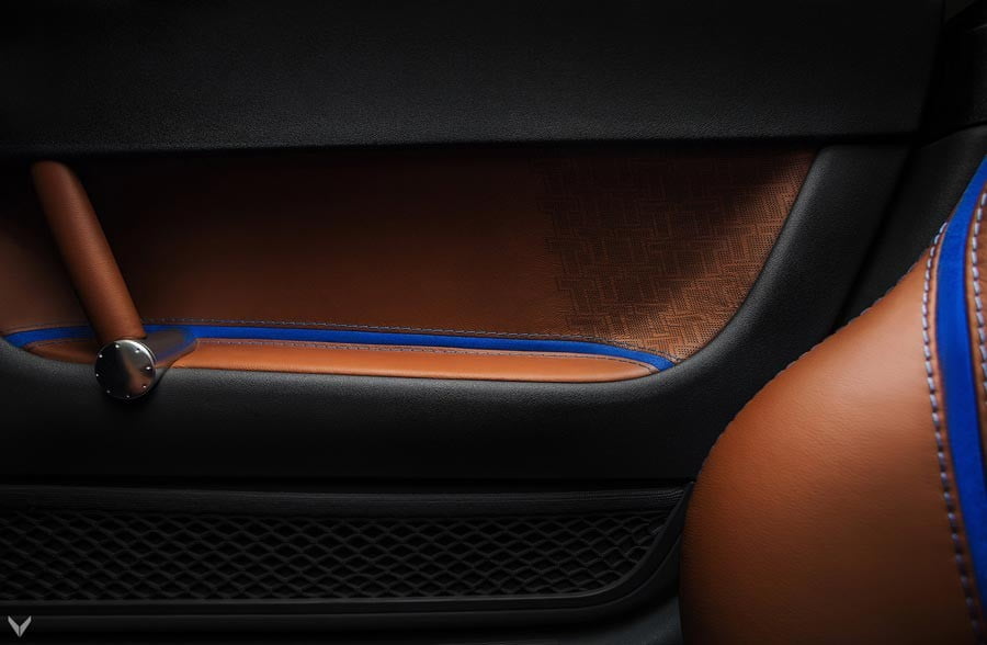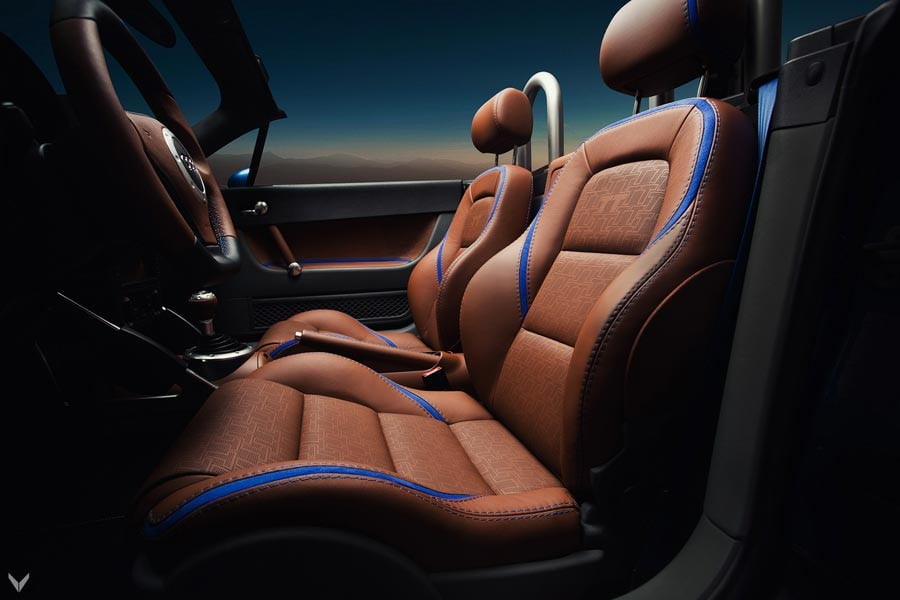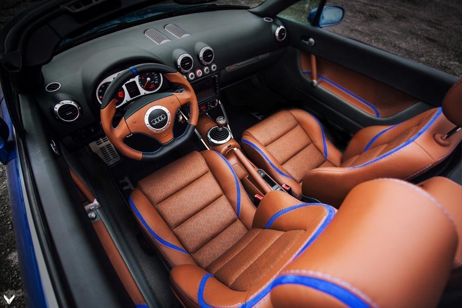 Κάτι που ισχύει για το συγκεκριμένο Audi TT Roadster του 1998 με το πολύ όμορφο εσωτερικό που μεταμόρφωσε η εταιρεία Vilner από τη Βουλγαρία. Οι μαύρες εργοστασιακές επενδύσεις αντικαταστάθηκαν από καφέ απόχρωσης συνδυασμένες με ένθετα από μπλε αλκαντάρα παρόμοιου χρώματος με το αμάξωμα. Με καφέ δέρμα και μπλε ραφές έχει επενδυθεί ακόμα ολόκληρη η κεντρική κονσόλα και το χειρόφρενο, ενώ μπλε απόχρωση έχουν και οι ζώνες ασφαλείας.