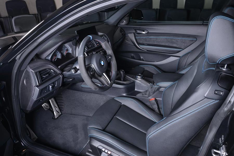Στο εσωτερικό ξεχωρίζουν οι έξτρα επενδύσεις από ανθρακονήματα στο ταμπλό, την κονσόλα, τον επιλογέα ταχυτήτων και το χειρόφρενο, αλλά και στο M Performance τιμόνι. Παράλληλα, ξεχωριστό στοιχείο αποτελούν και οι μπλε ραφές στα μαύρα δέρματα που ντύνουν το σαλόνι, το εσωτερικό των θυρών και τμήματα του τούνελ της κονσόλας.