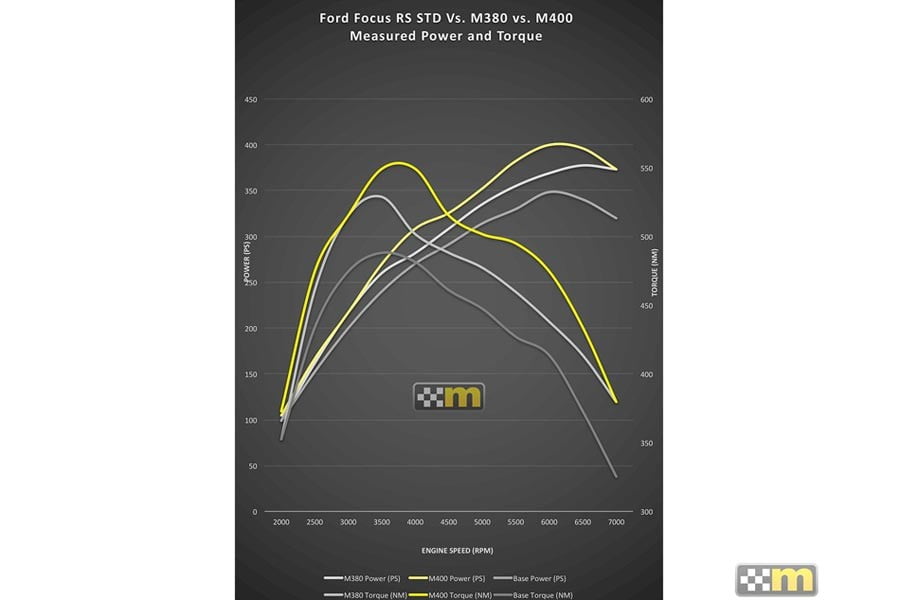 Το νέο κιτ M400 για το Ford Focus RS περιλαμβάνει επαναπρογραμματισμό του εγκεφάλου, νέο φίλτρο αέρα υψηλής ροής, αναβαθμισμένη βαλβίδα εκτόνωσης, νέο intercooler, σπορ καταλύτη, νέα εξάτμιση και κολάρα. Επιδόσεις δεν αναφέρει η Mountune με τους 400 ίππους του Focus RS, ωστόσο λέει ότι παρουσιάζει βελτιωμένο χρόνο στα 0-100 χλμ./ώρα, στα 0-400 μ., αλλά και στις πιο υψηλές ταχύτητες.
