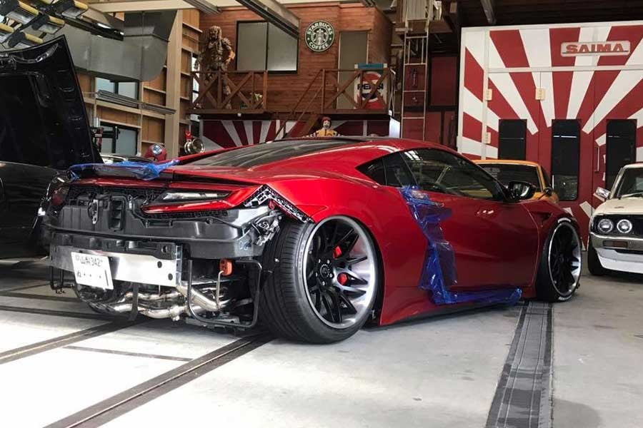 Στην δεύτερη εικόνα βλέπουμε το Honda NSX σε κόκκινο χρώμα, στις εγκαταστάσεις της Liberty Walk να είναι υπό κατασκευή. Έχει ήδη αποκτήσει αερανάρτηση ρυθμιζόμενη σε ύψος, όπως υποδηλώνει και η απόστασή του από το έδαφος, ενώ διαθέτει δίχρωμες ζάντες (μαύρο-ασημί), αλλά και κάποια μέρη από το bodykit, όπως το εμπρός δεξί φτερό (όπως φαίνεται από την εικόνα).