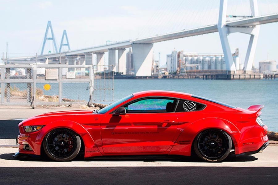 Στην συγκεκριμένη περίπτωση πάντως, πρωταγωνιστή μία Mustang, η οποία φυσικά έχει το κλασσικό wide body kit του Ιάπωνα βελτιωτή με τα πριτσινωτά φτερά να συνοδεύονται από αυξημένα μετατρόχια, αερανάρτηση με ρυθμιζόμενο ύψος, σπόιλερ περιμετρικά του αμαξώματος και διακριτική αεροτομή.