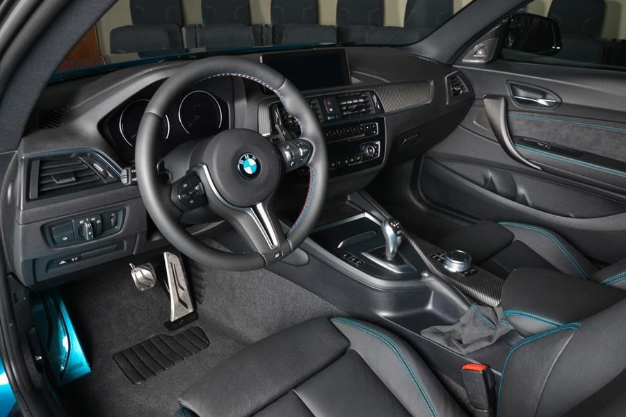 Όσο για το εσωτερικό αυτής της BMW M2 ξεχωρίζουν οι μαύρες δερμάτινες επενδύσεις με τις μπλε ραφές ίδιας απόχρωσης με το Long Beach Blue χρώμα του αμαξώματος και τα διακοσμητικά από ανθρακόνημα στο ταμπλό, στις πόρτες και στην κονσόλα.
