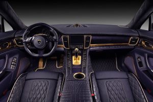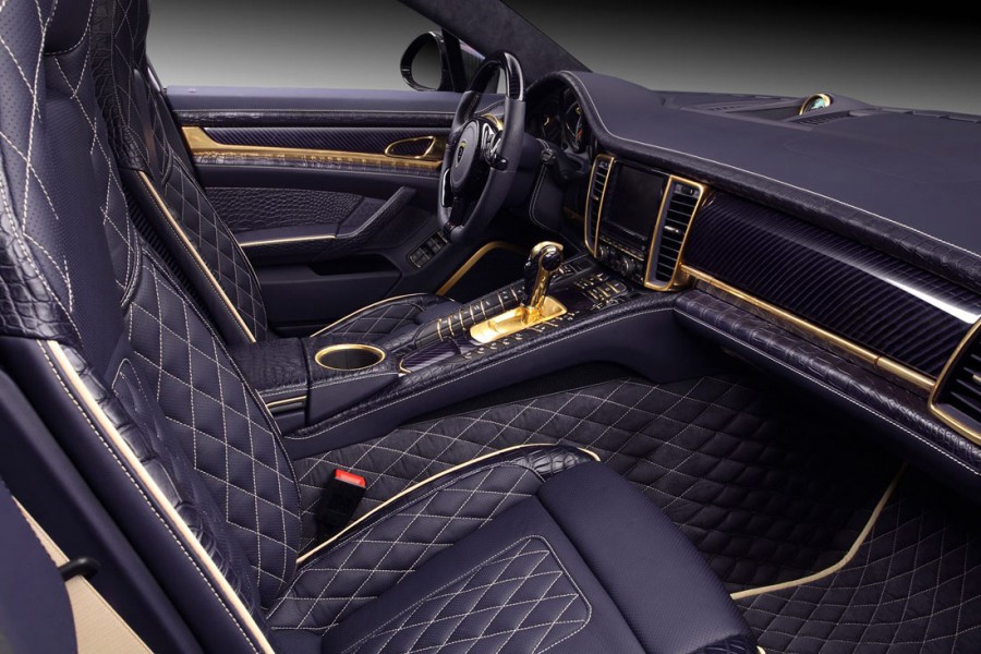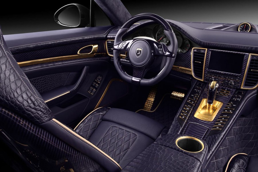 Η ρώσικη εταιρία βελτιώσεων TopCar παρουσιάζει μια Porsche Panamera Turbo S για πελάτες με πολύ ιδιαίτερα γούστα ή μάλλον για… κιτς και κακόγουστους με εσωτερικό ντυμένο με μοβ δέρμα κροκόδειλου και επενδύσεις από χρυσό. Για το κόστος της μετατροπής δεν υπάρχει αναφορά, ωστόσο η Panamera Stingray GTR (όπως ονομάζεται από την TopCar) διαθέτει και πολλές αλλαγές στο αμάξωμα. Ενδεικτικά το body kit με τμήματα από ανθρακόνημα φτάνει το συνολικό κόστος των 47.150 ευρώ. Αν προστεθούν και κάποια ακόμα αξεσουάρ, τότε φτάνει κοντά στις 60.000 ευρώ!