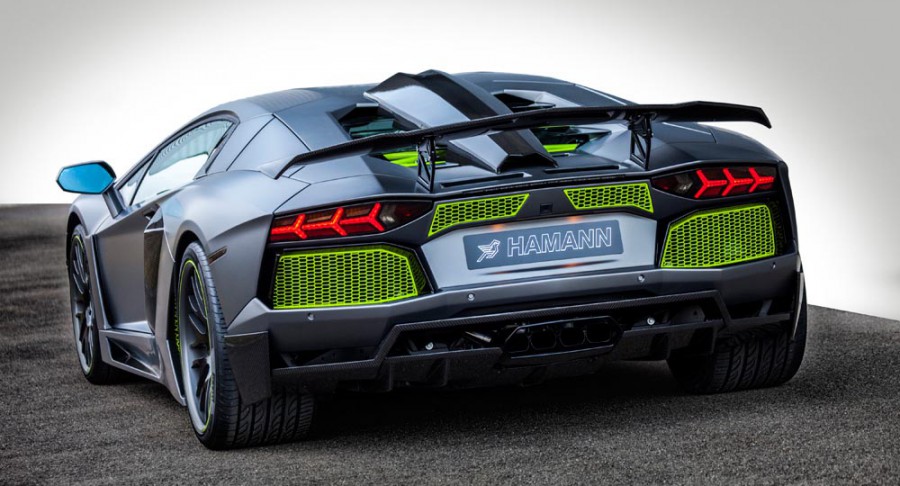 Όμως η Hamann δεν έμεινε μόνο στο χρώμα, αφού εξοπλίζει την Aventador με αρκετά ανθρακονημάτινα τμήματα, όπως τους ειδικά σχεδιασμένους αεραγωγούς δεξιά και αριστερά από το λογότυπο της Lamborghini στο εμπρός μέρος, αλλά και το έξτρα σπόιλερ κάτω από τον προφυλακτήρα. Στο πλάι, νέες ποδιές βελτιώνουν την αεροδυναμική, ενώ πίσω, διακρίνεται η επιθετική αεροτομή -ρυθμιζόμενη μάλιστα- από ανθρακονήματα, όπως και ο νέος διαχύτης, που πλαισιώνει τις τέσσερις ξεχωριστές απολήξεις της εξάτμισης. Στο εσωτερικό της Aventador, μόνο τα νέα δέρματα σε πράσινο και μαύρο χρωματισμό, διαφοροποιούν την πρόταση της Hamann.