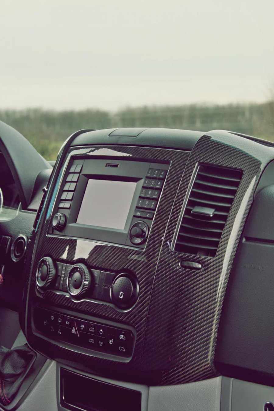 Στο εσωτερικό, το βελτιωμένο Sprinter διαθέτει δερμάτινες επενδύσεις με κόκκινες ραφές στα καθίσματα, στις πόρτες, στο τιμόνι και στον επιλογέα των ταχυτήτων, ενώ σπορτίφ νότα προσθέτουν τα διακοσμητικά από ανθρακόνημα και τα ανοξείδωτα τμήματα στα μαρσπιέ και τα πεντάλ.