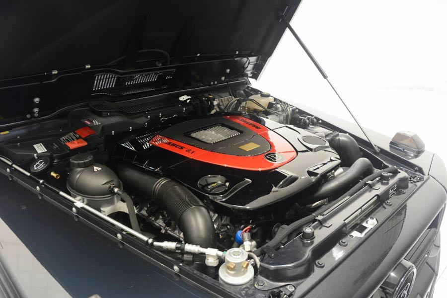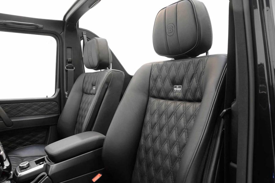 Στο εσωτερικό του mucho Mercedes G 500 Cabrio by BRABUS υπάρχουν νέες δερμάτινες επενδύσεις σε καθίσματα, ταμπλό και πόρτες, σπορ τιμόνι και μαύρες γυαλιστερές προσθήκες τύπου λάκας πιάνου. Όσο για τον κινητήρα των 6.1 λίτρων, ο οποίος βασίζεται στον V8 των 5.5 λίτρων, ωστόσο αποδίδει 462 ίππους και 615 Nm ροπής (έναντι 387 PS και 530 Nm του G 500), ενώ η μεικτή κατανάλωση ανέρχεται στα… μόλις 14,1 λτ./100 χλμ.