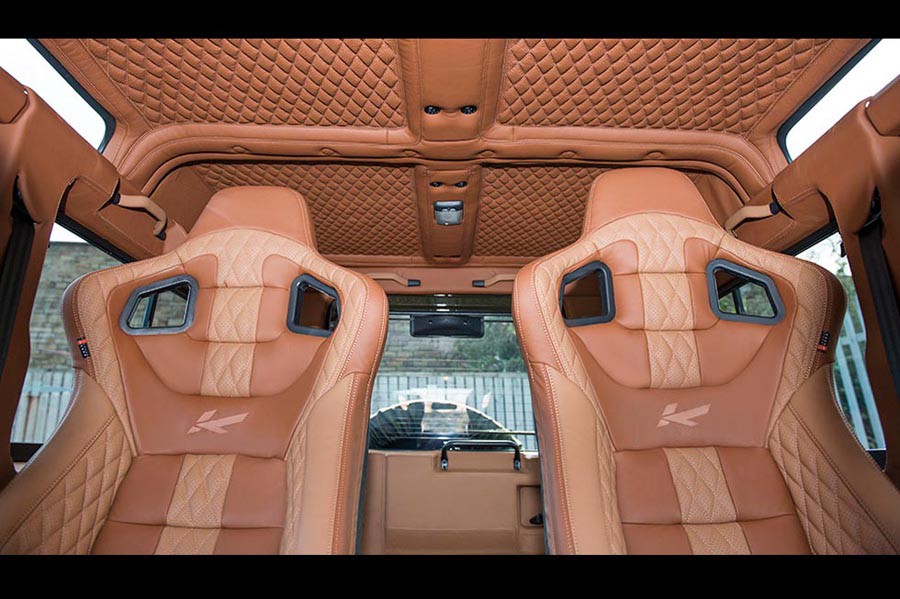 Ακόμα πιο εντυπωσιακό για Defender είναι το εσωτερικό, το οποίο παραπέμπει σε σπορ πολυτελές αυτοκίνητο. Ολόκληρη η καμπίνα είναι επενδυμένη με καφέ – μπεζ δέρμα, ενώ τα εμπρός μπάκετ καθίσματα βγάζουν μάτια! Επίσης, εφοδιάζεται με φώτα εισόδου LED, με σύστημα πολυμέσων, με κάμερα οπισθοπορείας, με αλουμινένια πεντάλ και με ξύλινο πίσω δάπεδο.