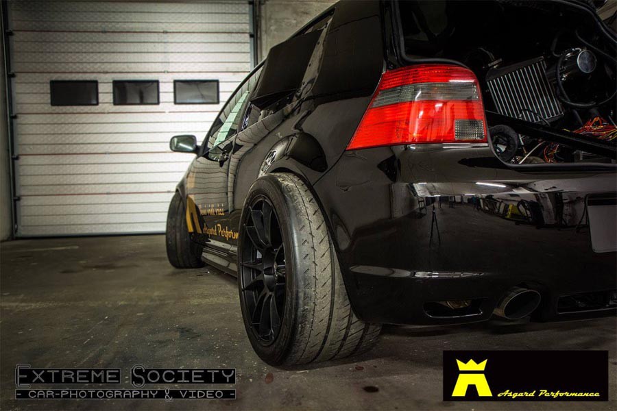 Άκρως extreme μετατροπή σε VW Golf IV, στο οποίο τοποθετήθηκε V10 κινητήρας 5.2 λτ. από Lamborghini Gallardo! Παράλληλα, με την προσθήκη διπλού turbo και πάρα πολλές ακόμα βελτιώσεις η απόδοση σχεδόν τριπλασιάστηκε και έφτασε τους 1.500 ίππους και τα 1.760 Nm ροπής. Σε συνδυασμό με το χαμηλό βάρος των 900 κιλών του αμαξώματος η αναλογία ισχύος/βάρος ανέρχεται μόνο στα 1,66 κιλά/ίππο, οπότε οι επιταχύνσεις (δεν αναφέρονται) θα είναι σίγουρα απίστευτα ταχύτατες. Η Γερμανική εταιρεία βελτιώσεων Asgard Performance παρουσιάζει τις πρώτες φωτογραφίες από το «κτηνώδες» Golf, το οποίο μπορούμε να ακούσουμε και στο παρακάτω βίντεο.