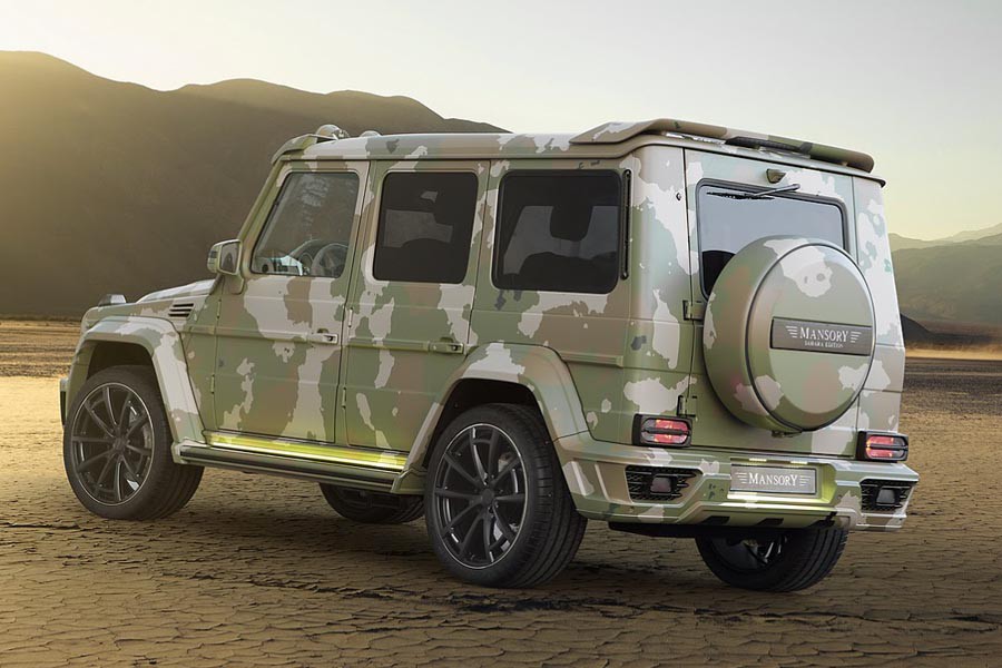 Η Mansory παρουσιάζει μία από τις πιο extreme μετατροπές της, το νέο μοντέλο Sahara Edition, το οποίο βασίζεται στη Mercedes G 63 AMG, ενώ στο αμάξωμά της με το καμουφλάζ έχουν προστεθεί πολλά τμήματα από ανθρακόνημα. Από το εν λόγω ελαφρύ και ανθεκτικό υλικό είναι κατασκευασμένες οι προσθήκες στους θόλους των τροχών, οι προφυλακτήρες, το καπό κ.λπ. Αλλαγμένα είναι επίσης τα φωτιστικά σώματα, η μάσκα και στην οροφή τοποθετήθηκε αεροτομή πίσω και τέσσερις στρογγυλοί προβολείς μπροστά. Το όλο πακέτο συμπληρώνουν οι διαθέσιμες ζάντες διαμέτρου 21 έως 23 ιντσών. Η Mansory προτείνει τις 22άρες ζάντες με ελαστικά 305/35.