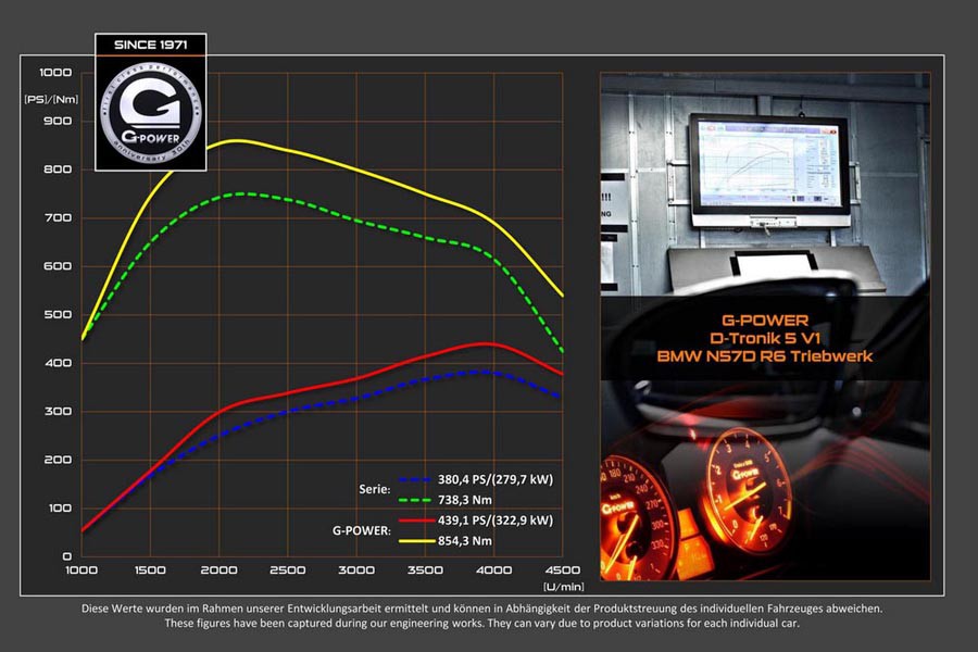 Από πλευράς επιδόσεων, η αναβαθμισμένη οικογενειακή μεγάλη και πολυτελής BMW των 2+ τόνων βάρους, επιταχύνει στα 0-100 χλμ./ώρα σε μόλις 4,5 δευτερόλεπτα και η τελική ταχύτητα ξεπερνά τα 270 χλμ./ώρα. Σε μέτρηση με GPS, η τελική ταχύτητα άγγιξε τα 271,4 χλμ./ώρα και σύμφωνα με την G-Power είναι ρεκόρ για BMW ντίζελ στέισον βάγκον.