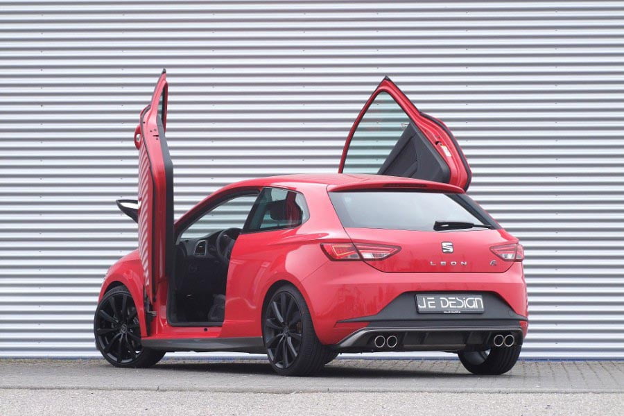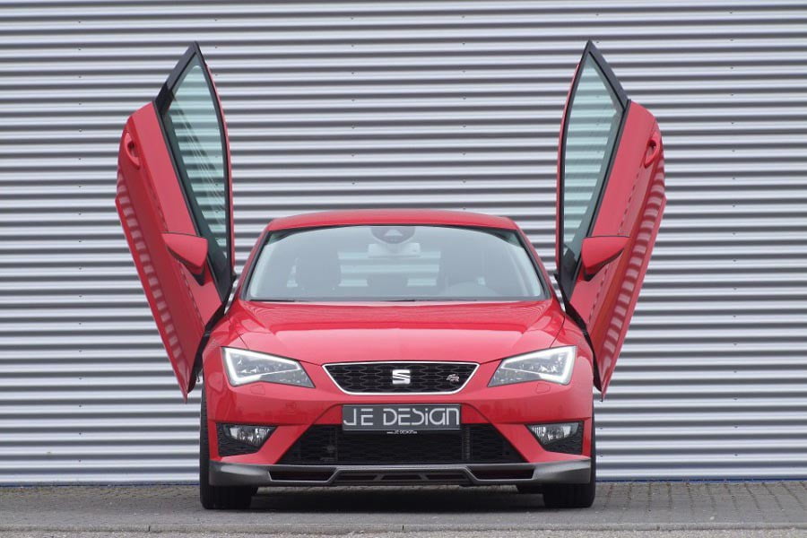 Η Je Design διευρύνει τις επιλογές αισθητικής αναβάθμισης του 3θυρου SEAT Leon SC με την προσθήκη των εμπρός θυρών LSD (Lamborghini Style Doors). Οι εν λόγω μεγάλες πόρτες που ανοίγουν προς τα πάνω εξασφαλίζουν σίγουρα πιο εντυπωσιακή εμφάνιση στο μικρομεσαίο SEAT, ενώ συνοδεύονται από πιστοποιητικό επίσημου οργανισμού δοκιμών.