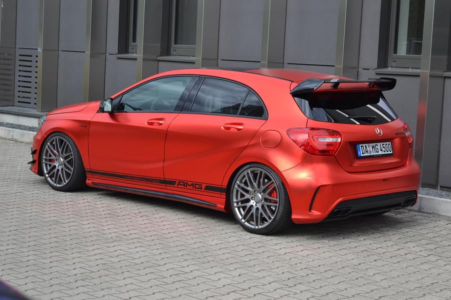 Εξωτερικά η βελτιωμένη Mercedes A45 AMG είναι ολόκληρη ντυμένη με κόκκινη ματ μεμβράνη, αξίας 4.200 ευρώ. Επιπλέον, εφοδιάζεται με νέα ανάρτηση (3.000 ευρώ) και με 19άρες ζάντες συνδυασμένες με ελαστικά 235/35, αξίας 4.500 ευρώ. Περνώντας στον κινητήρα, ο 2λιτρος AMG αποδίδει μετά τη μετατροπή 435 ίππους, μέσω αλλαγής της χαρτογράφησης του εγκεφάλου, των νέων αγωνιστικών φίλτρων και του σπορ συστήματος εξάτμισης (συνολικής αξίας 7.117 ευρώ).