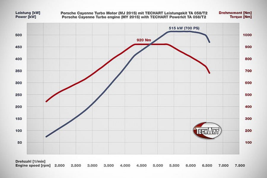 Η εταιρεία βελτιώσεων Techart, η οποία ειδικεύεται στις αναβαθμίσεις των μοντέλων της Porsche, παρουσιάζει το νέο powerkit για την Porsche Cayenne Turbo. O V8 κινητήρας των 4.8 λτ. εργοστασιακής ισχύος 520 ίππων και 750 Nm ροπής αποδίδει μετά τη μετατροπή 700 ίππους στις 5.400 σ.α.λ. και 920 Nm ροπής στις 4.400 σ.α.λ., εκτοξεύοντας το μεγάλο SUV σε κάθε επιτάχυνση. Τα 0-100 χλμ./ώρα επιτυγχάνονται σε 3,9 δλ. (έναντι 4,4 δλ.), τα 0-160 χλμ./ώρα σε 9,1 δλ. (έναντι 10,0 δλ.), τα 0-200 χλμ./ώρα σε 13,8 δλ. και η τελική ταχύτητα φτάνει τα 308 χλμ./ώρα (έναντι 279 χλμ./ώρα).