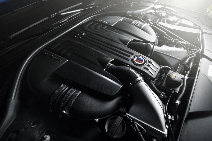 Κάτω από το μακρύ εμπρός καπό της φιλοξενείται ένας βελτιωμένος 4.4 λτ. V8 twin-turbo βενζινοκινητήρας, με ανεβασμένη ισχύ 608 ίππων στις 5.750 σ.α.λ. και ροπή 800 Nm από τις 3.000 σ.α.λ. Το μηχανικό αυτό σύνολο συνδυάζεται με ένα 8άρι Sport αυτόματο κιβώτιο που αποτελεί δημιουργία της Alpina με τη ZF. Σε συνδυασμό και με την τετρακίνησης, το 0-100 χλμ./ώρα η μήκους 5.250 μ. και βάρους 2.110 κιλών σπορ limo απαιτεί μόλις 3,7 δευτερόλεπτα, ενώ η τελική ταχύτητα του αυτοκινήτου αγγίζει τα 310 χλμ./ώρα. Όσο για την κατανάλωση και τις εκπομπές CO2, ανέρχονται στα 10,4 λτ./100 χλμ. και 242 γρ./χλμ. αντίστοιχα.