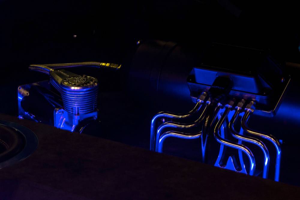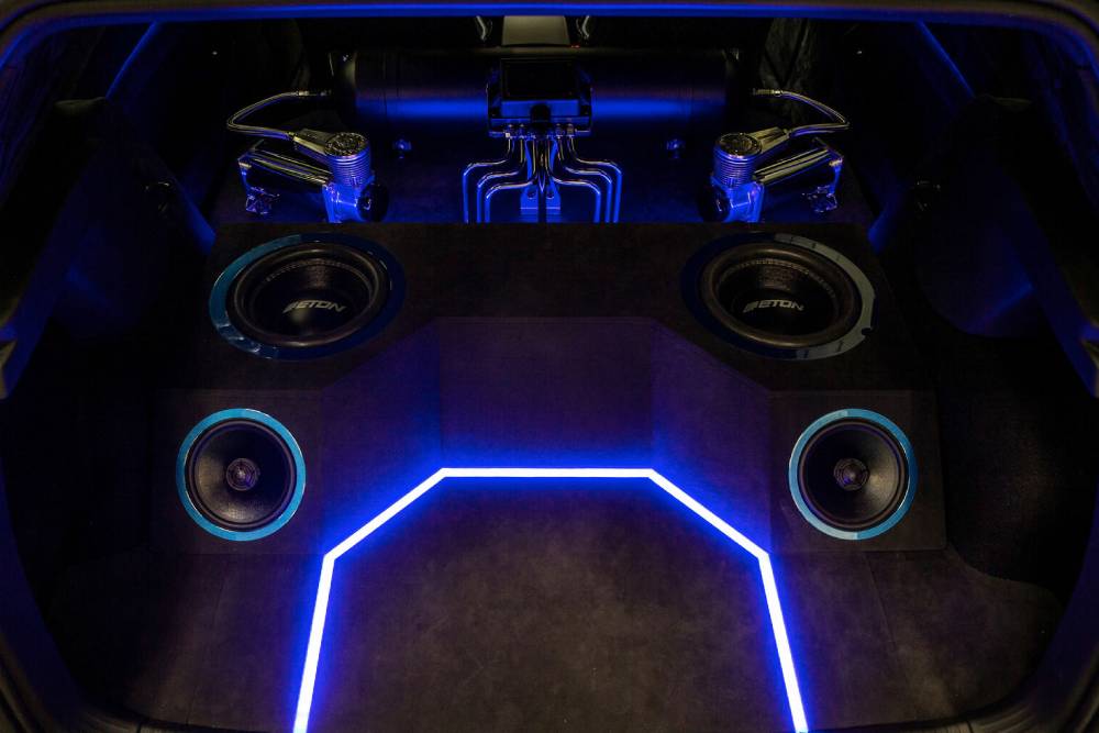 Στο εσωτερικό κυριαρχούν οι suede επενδύσεις σε κάθε σπιθαμή, με κεντρικούς πρωταγωνιστές τα δυο ανθρακονημάτινα μπάκετ. Πίσω δεν υπάρχουν καθίσματα, αλλά ούτε και roll cage, όπως θα περίμενες βλέποντας το εξωτερικό. Βέβαια, περιμένεις λίγο και αυτό που εν τέλει συναντάς: ένα θηριώδες ηχοσύστημα, βγαλμένο από τις χρυσές εποχές του «The Fast and the Furious»! Ενισχυτές, woofer και τεράστια ηχεία συνθέτουν το εντυπωσιακό ηχοσύστημα, που γίνεται ακόμα πιο εντυπωσιακό χάρις στον ambient φωτισμό.