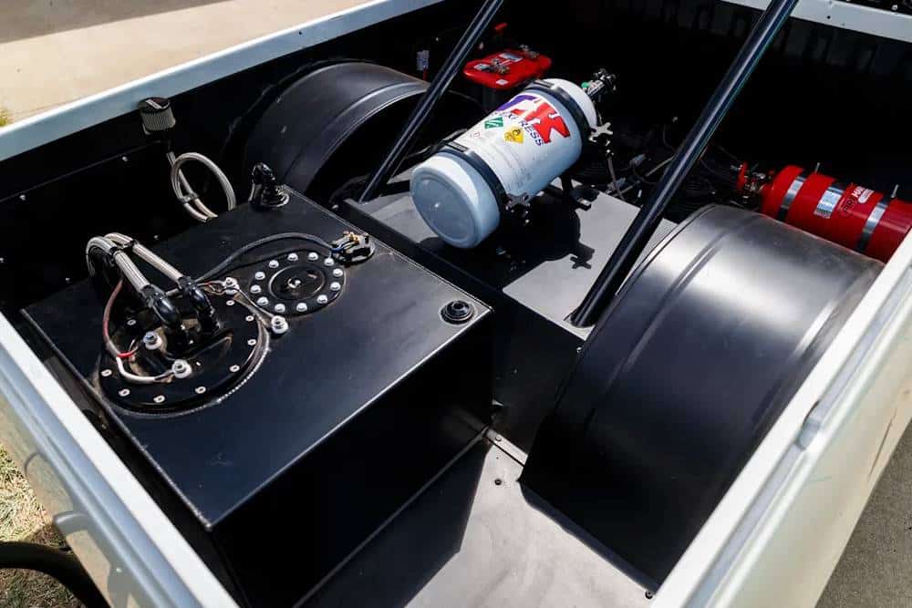 Προφανώς τόση δύναμη θα μάσαγε σαν τσίχλα το πλαίσιο δίχως ενισχύσεις, οπότε δεν προκαλεί εντύπωση πως το σασί έχει αντικατασταθεί με νέο σωληνωτό, η ανάρτηση με αγωνιστική, τα ελαστικά με drag radials και το διαφορικό με βαρέως τύπου.