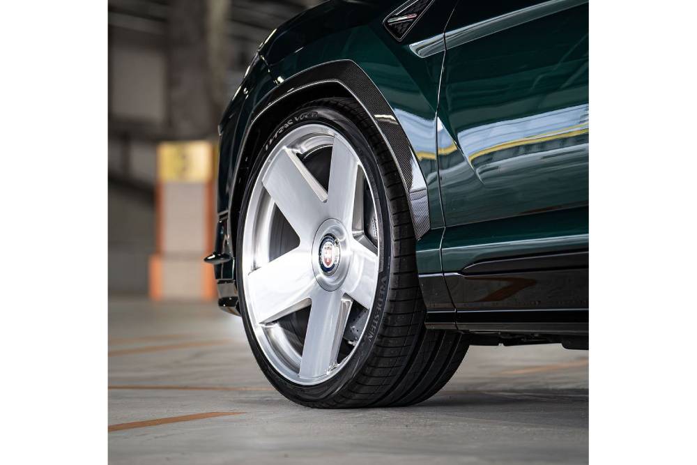 Ευτυχώς, στην Ιταλίδα που θαυμάζουμε. Προετοιμασμένη από την HRE Wheels, ώστε να διαφημίσει το μοντέλο L105M του Ελβετού κατασκευαστή ζαντών, η εν λόγω Urus Performante είναι ακριβώς όσο βελτιωμένη πρέπει να είναι. Με ένα μοναδικό, απαλό, βαθύ πράσινο χρώμα να ντύνει το αμάξωμα, διακριτικά ανθρακονημάτινα πάνελ σε προφυλακτήρες-φτερά-μαρσπιέ, και μια τετράδα «πατούμενα» μακριά από τις πολυάριθμες ακτίνες, τα ακραία σχέδια ή τις περίτεχνες εναλλαγές σε χρώματα-φινιρίσματα. Διαχρονική πεντάκτινη διάταξη, ελαφρώς «χωστή», με παχύ τον κάθε βραχίονα και διάσταση από 21 ως 24 ίντσες. Στις φωτογραφίες εμφανίζεται η μέγιστη διάμετρος, η οποία είναι κομμάτι υπερβολική. Το ίδιο σετ, στις 22 ίντσες, κι έφυγες – αφού πρώτα καταβάλλεις 3.700 δολάρια (3.455 ευρώ) για την καθεμιά! Η τετράδα, δηλαδή, κοστολογείται στις 14.800 δολάρια (13.819 ευρώ)!