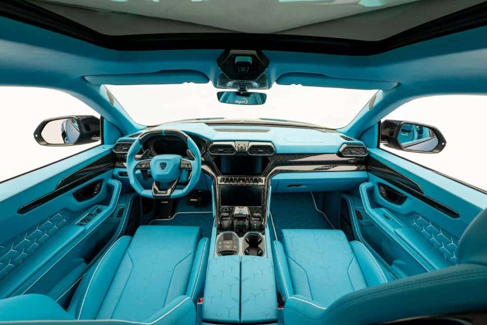 Το τελικό αποτέλεσμα τους δικαιώνει, καθώς μαζί με τα φουσκωμένα πάνελ που βρίσκονται στη θέση των πίσω θυρών, η δίθυρη πια Urus δεν δείχνει παράταιρη ή πρόχειρη σαν μετατροπή. Ο καταιγισμός ανθρακονημάτινων αεροδυναμικών βοηθημάτων, με πρωταγωνιστή τον πελώριο διαχύτη και την τριγωνική/τριπλή εξάτμιση στο κέντρο του, δεν σταματά να κρατά απασχολημένο το μάτι. Το ίδιο ισχύει για το εσωτερικό, όπου τα πάντα καλύπτονται από τιρκουάζ δέρμα και ανθρακονήματα.