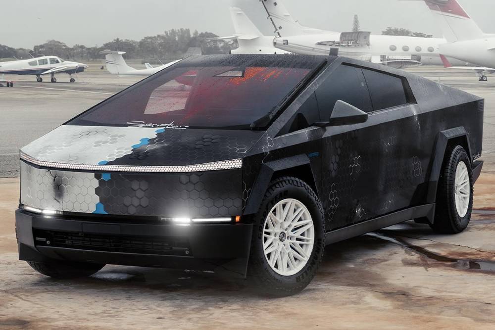 Όπως δηλώνουν οι Αμερικανοί, το βελτιωμένο Cybertruck φέρει νέο λογισμικό για την αερανάρτηση και αποστάτες, που χαμηλώνουν/φαρδαίνουν το παράστημα και συνθέτουν μια πολύ πιο «στημένη» εικόνα για το θηριώδες pick up (5.683 χλστ. μήκος, 2.201 χλστ. πλάτος). Πίσω από τις 20άρες ζάντες και τα μικτά ελαστικά Goodyear Wrangler υπάρχουν επίσης αναβαθμισμένα φρένα, ενώ η εμφάνιση διανθίζεται ακόμα από έξτρα φώτα LED. Από το εσωτερικό δεν έχουμε εικόνα, αλλά οι άνθρωποι της Signature Customs αναφέρουν νέες επενδύσεις σε καθίσματα/πόρτες/ταμπλό/τιμόνι, αναβαθμισμένο ambient φωτισμό και custom ηχοσύστημα της Focal. Τιμή δεν ανακοινώνουν, αλλά καταλαβαίνουμε πως μόνο προσιτό δεν θα είναι το «κοστουμάκι».
